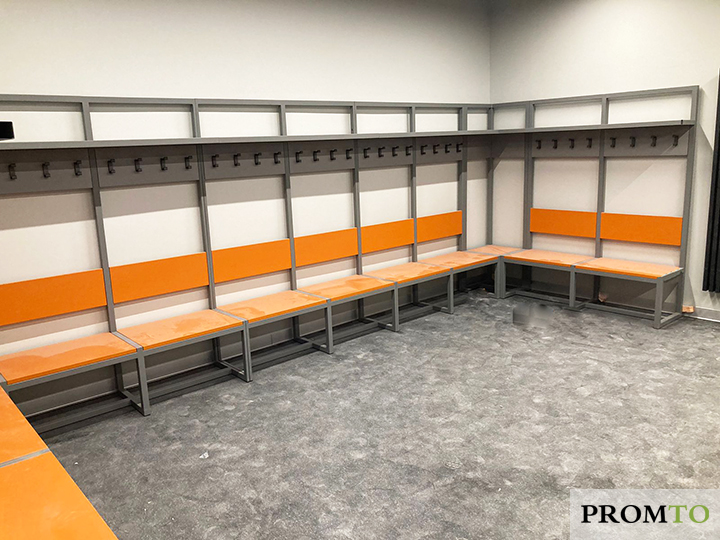 - Широкие скамьи на металлокаркасе с сидениями в облицовке пластиком (или HPL) — выдерживают влажные вещи и вес экипировки.